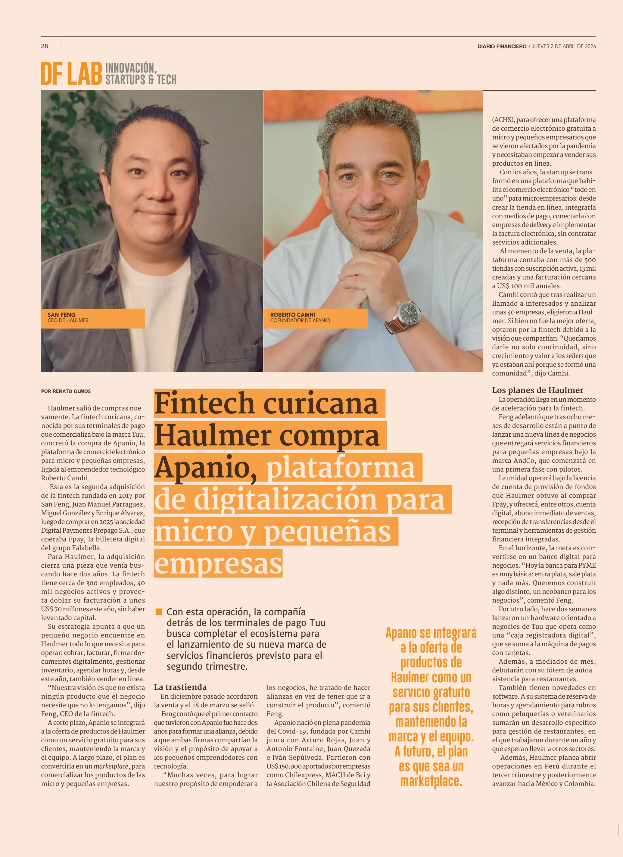 Haulmer, fintech curicana, compró Apanio, una plataforma de digitalización diseñada para micro y pequeñas empresas. Apanio fue desarrollada con aportes de empresas como Chilexpress, MACH de BCI y la Asociación Chilena de Seguridad (ACHS), y fue creada inicialmente para ofrecer comercio electrónico gratuito a emprendedores afectados por la pandemia que necesitaban comenzar a vender sus productos en línea. La adquisición representa la expansión de Haulmer en soluciones digitales para el segmento de pequeños empresarios.